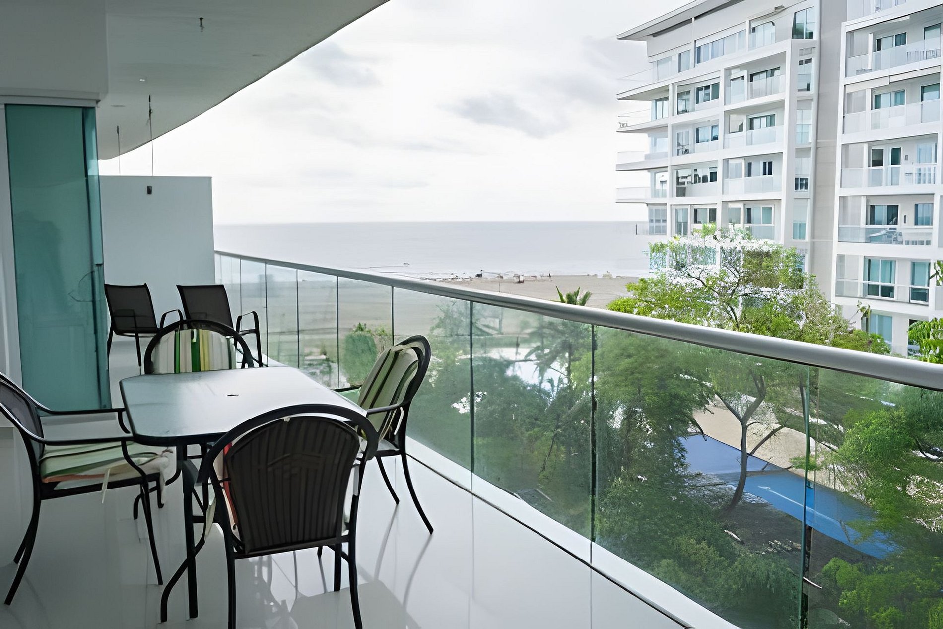 Nuestro apartamento está totalmente equipado para una estadía cómoda y práctica. Contamos con todos los utensilios de cocina esenciales, incluyendo licuadora, cafetera, microondas, nevera y vajilla completa. Además, dispones de una lavadora-secadora ideal para estancias más largas o familias. También disfrutarás de una sala amplia con Smart TV, comedor integrado, balcón con mobiliario exterior, aire acondicionado en todas las áreas, y conexión WiFi. Las áreas comunes del edificio incluyen una piscina frente al mar, gimnasio con vista tropical, salida directa a la playa y jardines para descansar bajo la sombra de las palmeras. Todo lo que ves en las fotos está disponible durante tu estadía. ¡Queremos que te sientas como en casa! IMPORTANTE: El edificio cobra una manilla de acceso de $11.000 COP por persona al momento del check-in, que permite el uso de todas las instalaciones como piscina, playa privada y zonas comunes. Es un requerimiento del conjunto para garantizar la seguridad y el control de los huéspedes.”