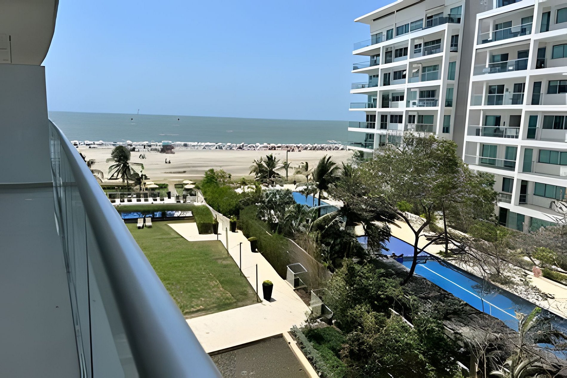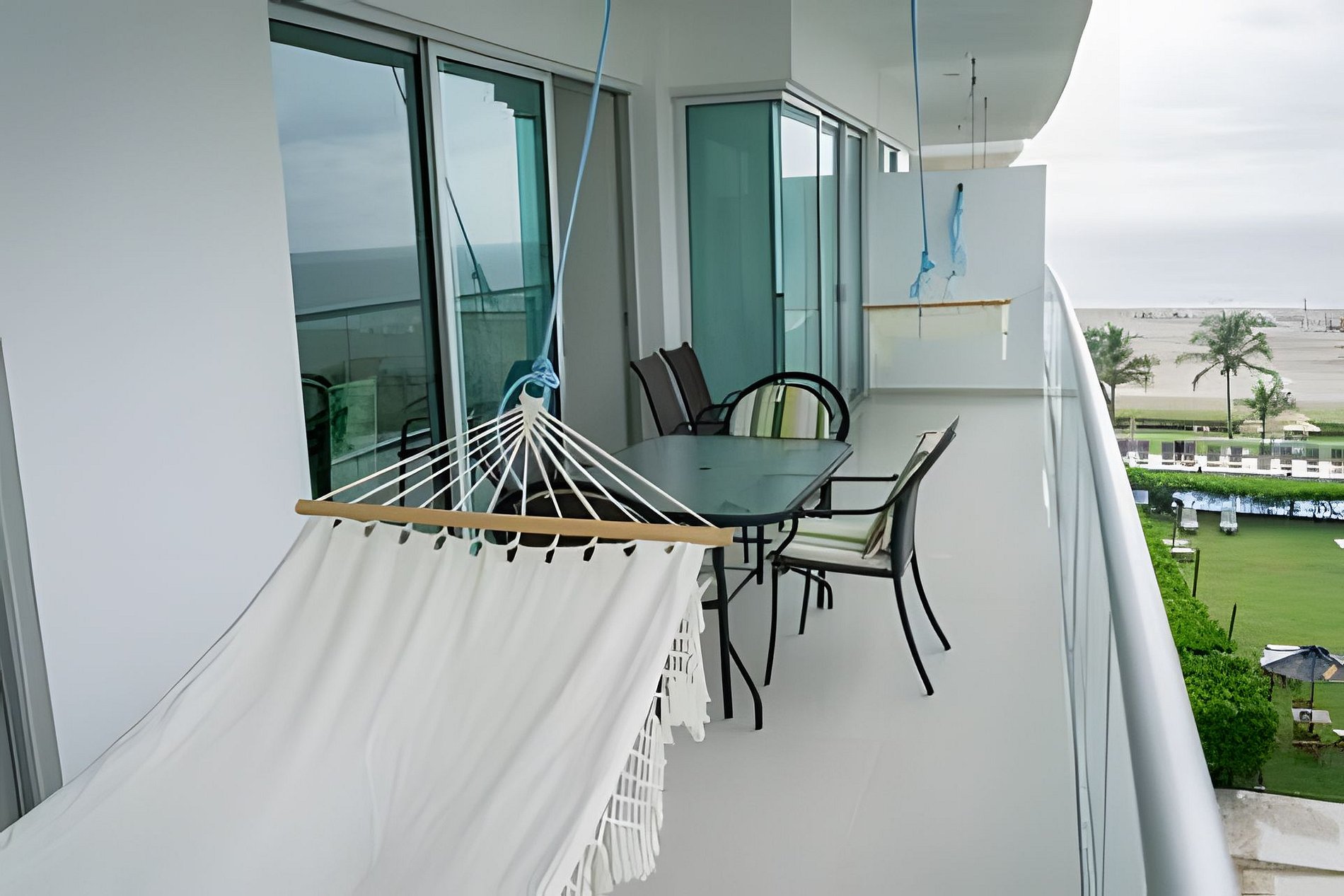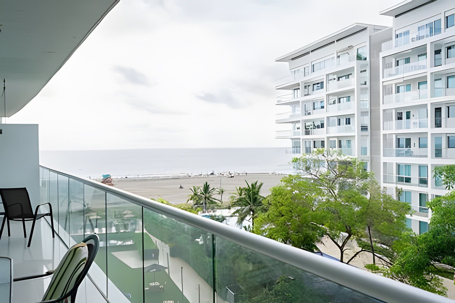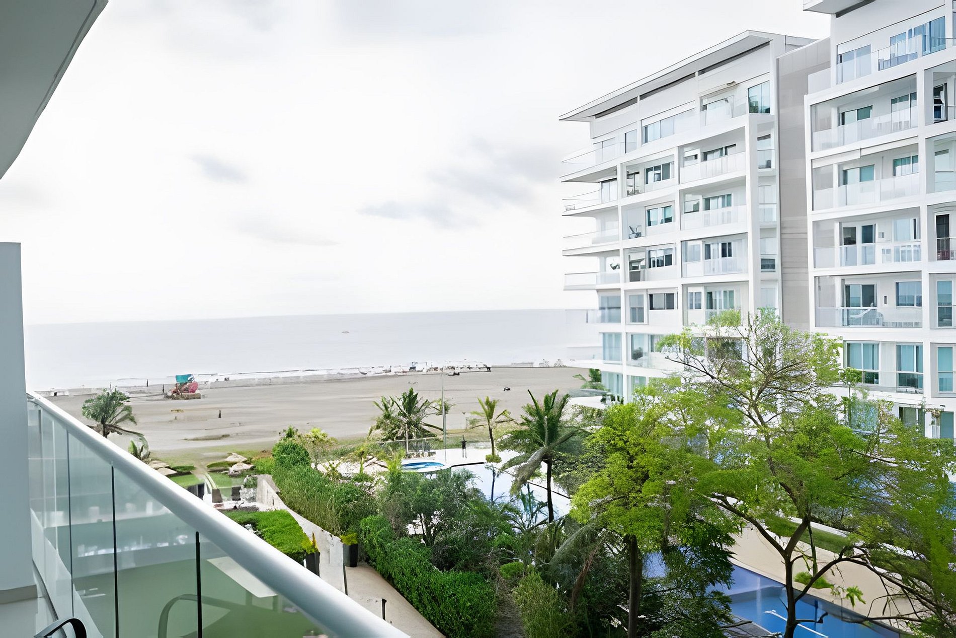También disfrutarás de una sala amplia con Smart TV, comedor integrado, balcón con mobiliario exterior, aire acondicionado en todas las áreas, y conexión WiFi. Las áreas comunes del edificio incluyen una piscina frente al mar, gimnasio con vista tropical, salida directa a la playa y jardines para descansar bajo la sombra de las palmeras.